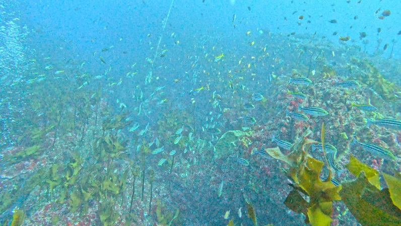 魚の群れがダイバーを追い越すように後ろから流れていきます。
